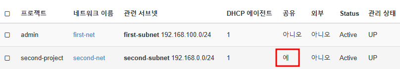 - 일반 사용자는 사설 방식의 네트워크만 생성 가능하며 이 네트워크는 해당 프로젝트에서만 사용 가능