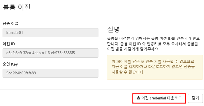 이전작업으로 전달 후 다른 프로젝트에서 받을때 id와 인증키를 사용해야 하므로 다운로드 하도록 하자.