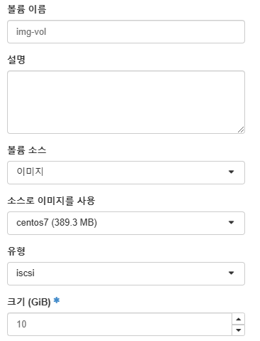 이미지(centos)를 볼륨으로 생성(크기는 10G)