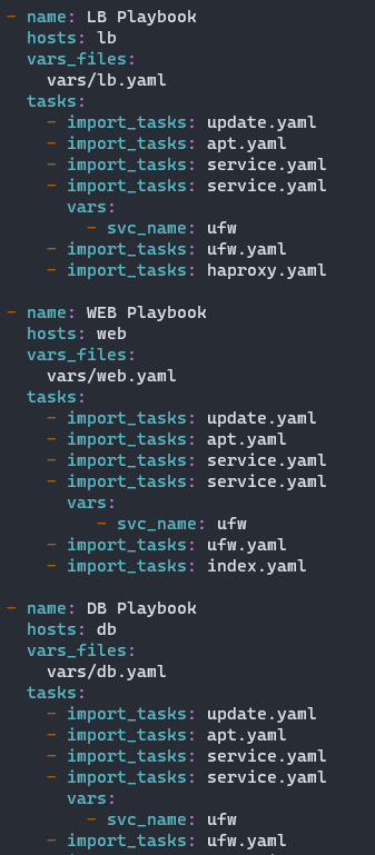 main Playbook에 LB, WEB, DB 모두 구분하여 작성하였으며,